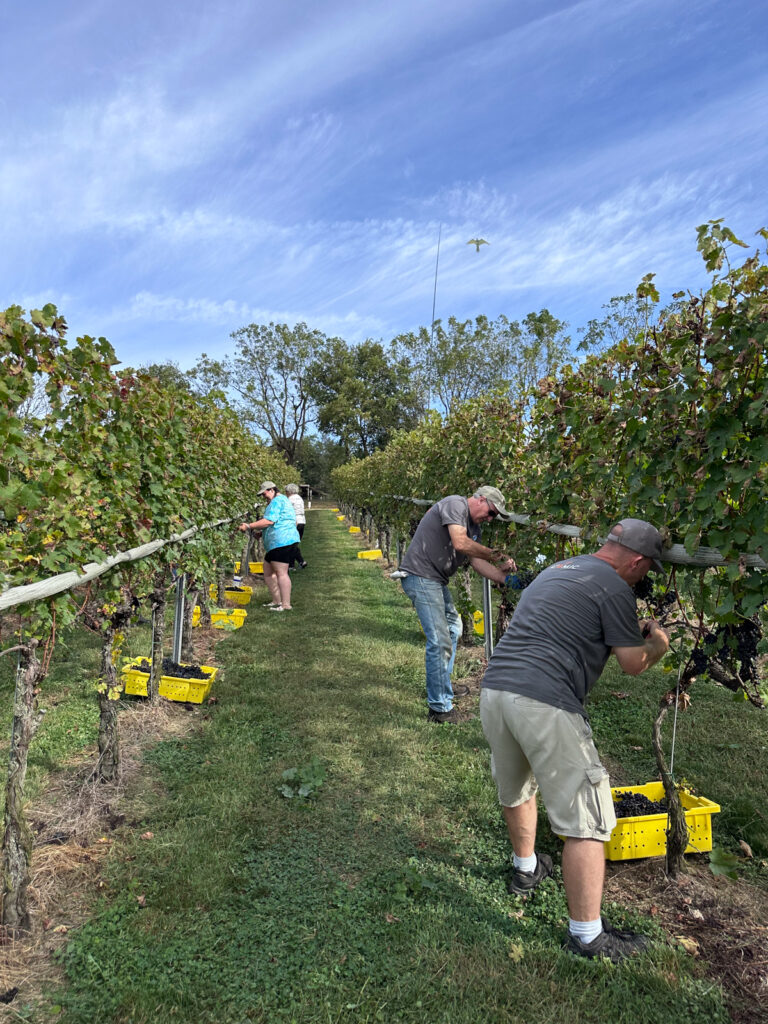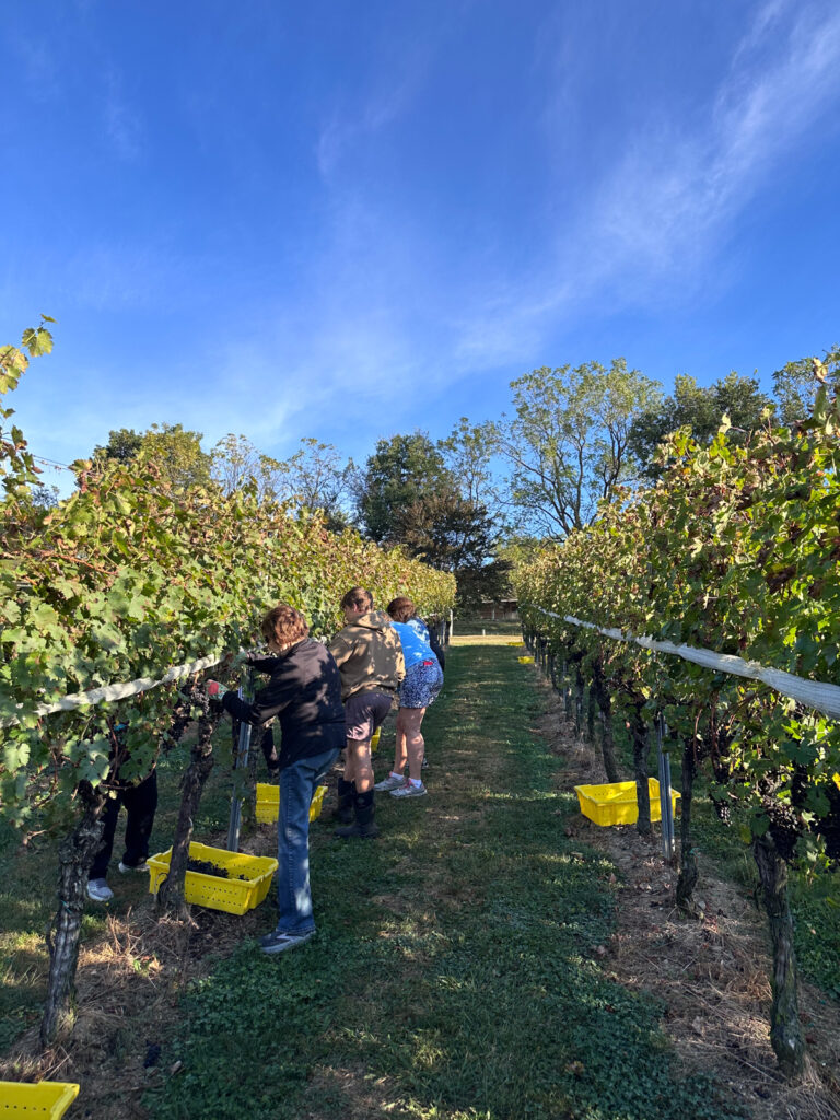 Harvest day starts early. By the time volunteers arrive, we’ve already done our final checks—confirmed the grapes are at peak ripeness, rolled up nets and set up the harvest bins. After a quick training session over donuts and coffee, everyone heads into the rows.