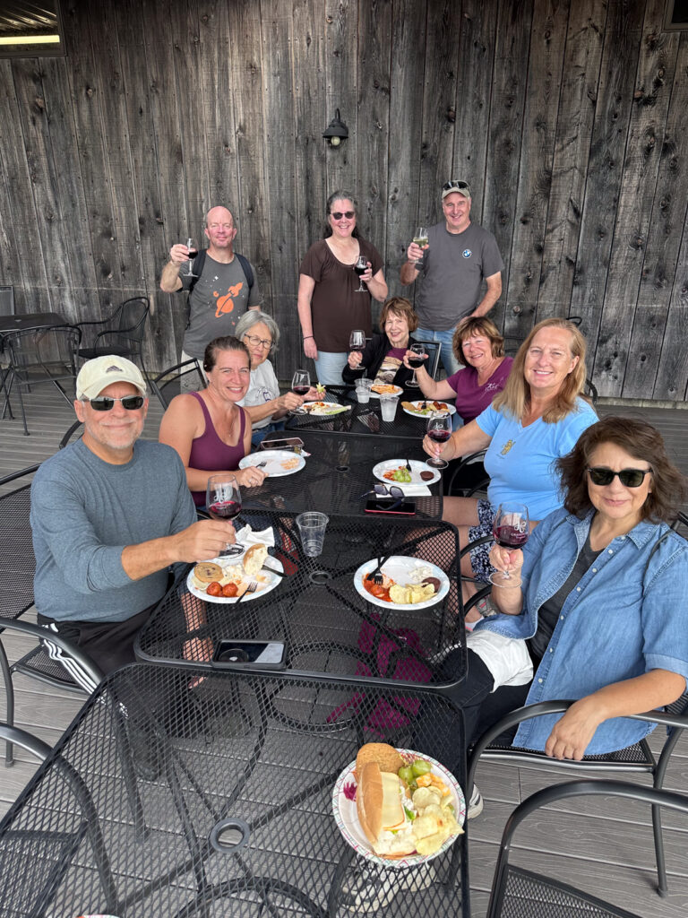 By late morning on the 2nd day of picking, both the Cabernet Franc and the Cabernet Sauvignon is picked! Bins full of grapes are already making their way up to the winery, where Scott will begin testing and processing them. The volunteers, meanwhile, gather on the deck for lunch.